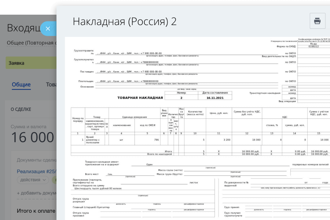 Создавайте товарные накладные, счета-фактуры, акты приемки и печатайте их прямо из CRM.